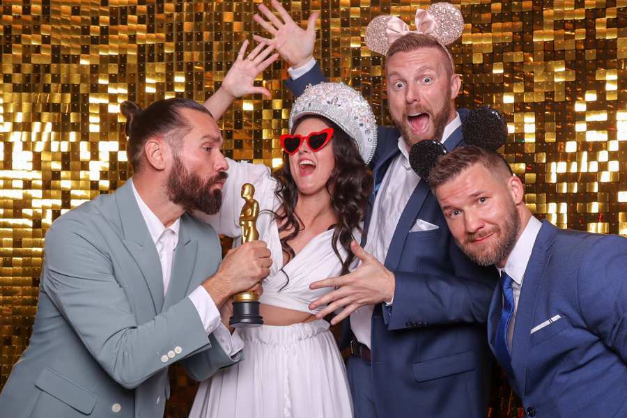 Kromě rekvizit vozíme i stylová pozadí. Pokud nejsou digitální (green screen), ladíme je do barev vaší oslavy – doplněné balónky, světýlky nebo dalšími dekoracemi. A pokud chcete něco opravdu extra, máme i panelové nebo květinové stěny.